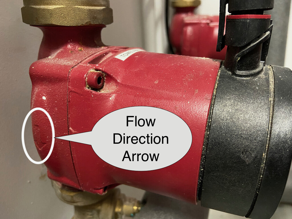 To confirm the pump flow direction, you will need to check the arrow cast into the metal body of the pump. That’s under the grey polystyrene insulating cover. Here it is on my pump (which doesn’t have an insulating cover).