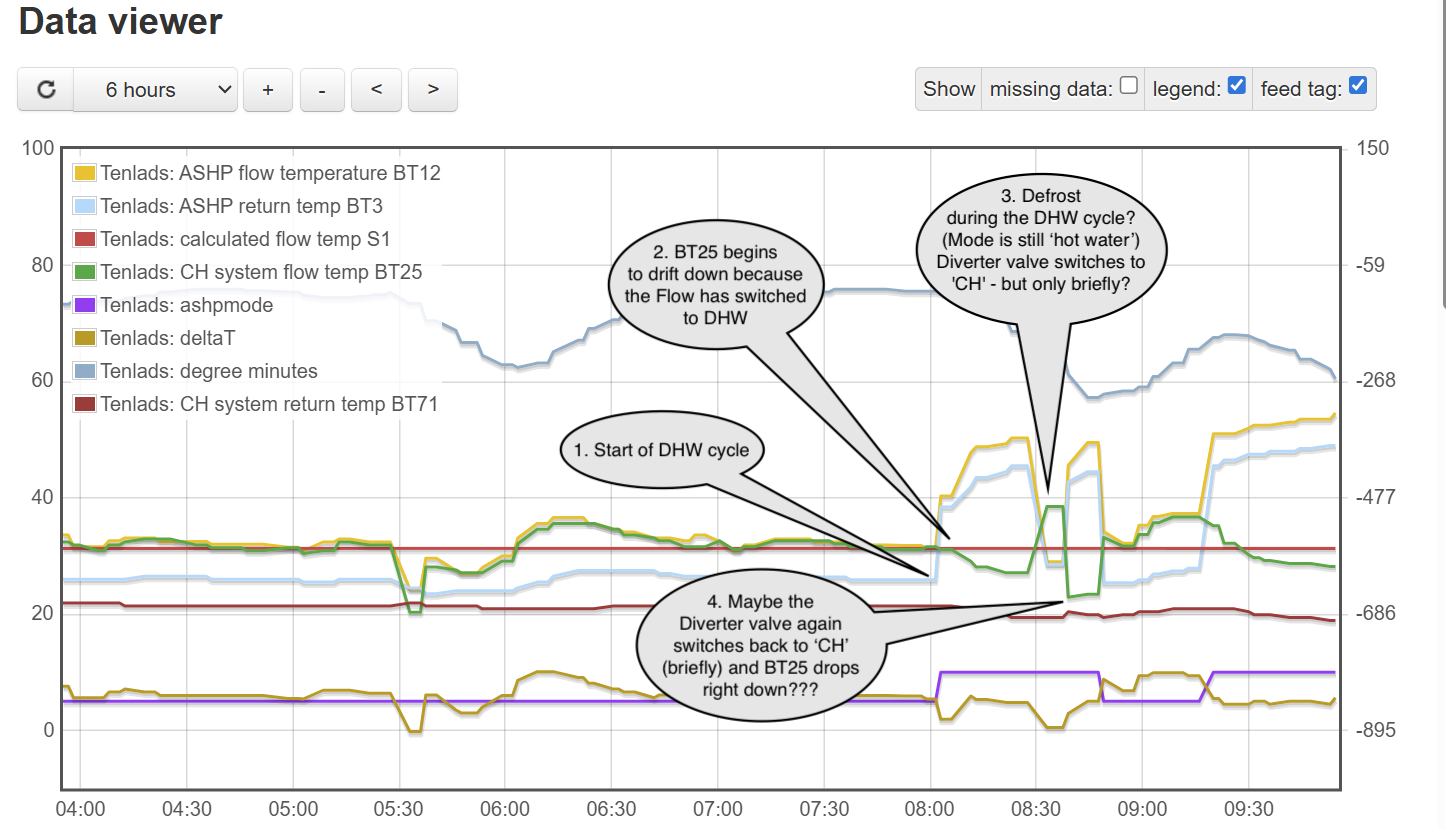 So my thinking is that - when needing to do a defrost during a DHW cycle - the controller is ‘testing’ the temperature of the heating water by briefly moving the diverter valve. Those valve movements could explain the sudden changes in the value for BT25 (which Dave has moved to the Heating pipework).