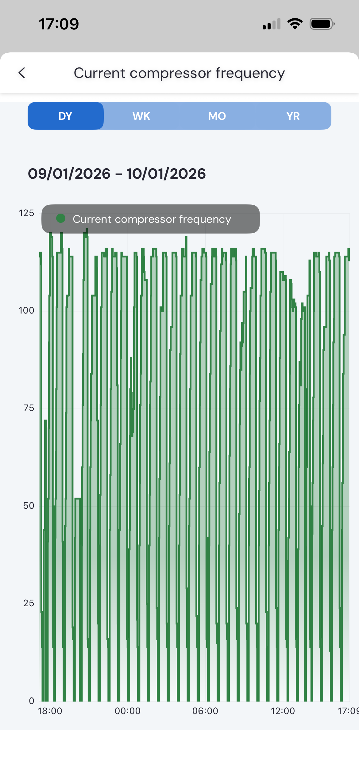 Would it be possible to include Compressor Frequency in the graph? My hunch is that the ‘flatlining’ is the controller modulating the compressor speed and so avoiding the on-off cycling which would happen when the DMs reach or exceed 0.