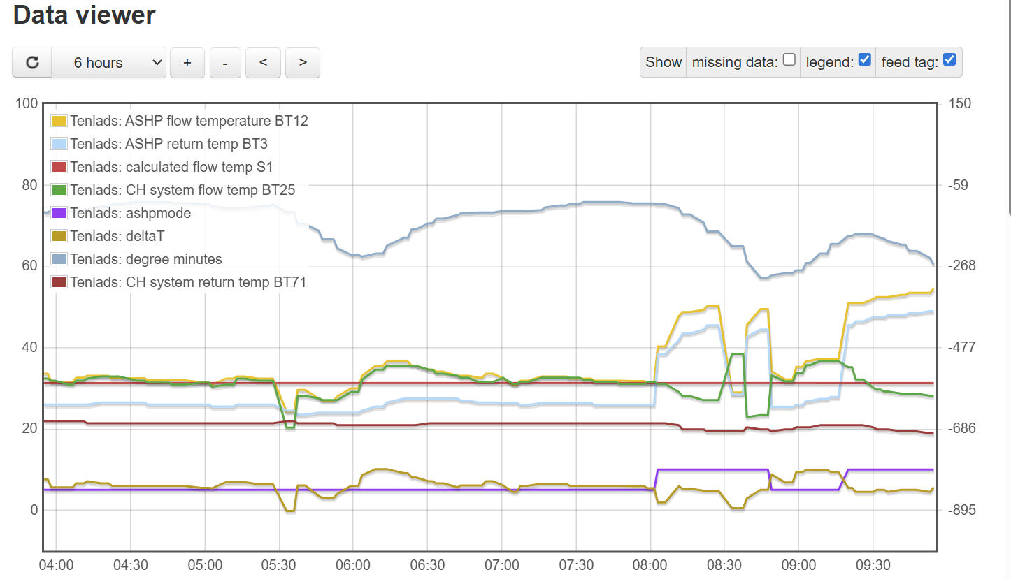 The defrosts can be inferred from the Flow temperatures but could we add the Defrost status to the graph too, for extra clarity? (It looks like the ‘ashpmode’ isn’t changing to reflect defrosting.)