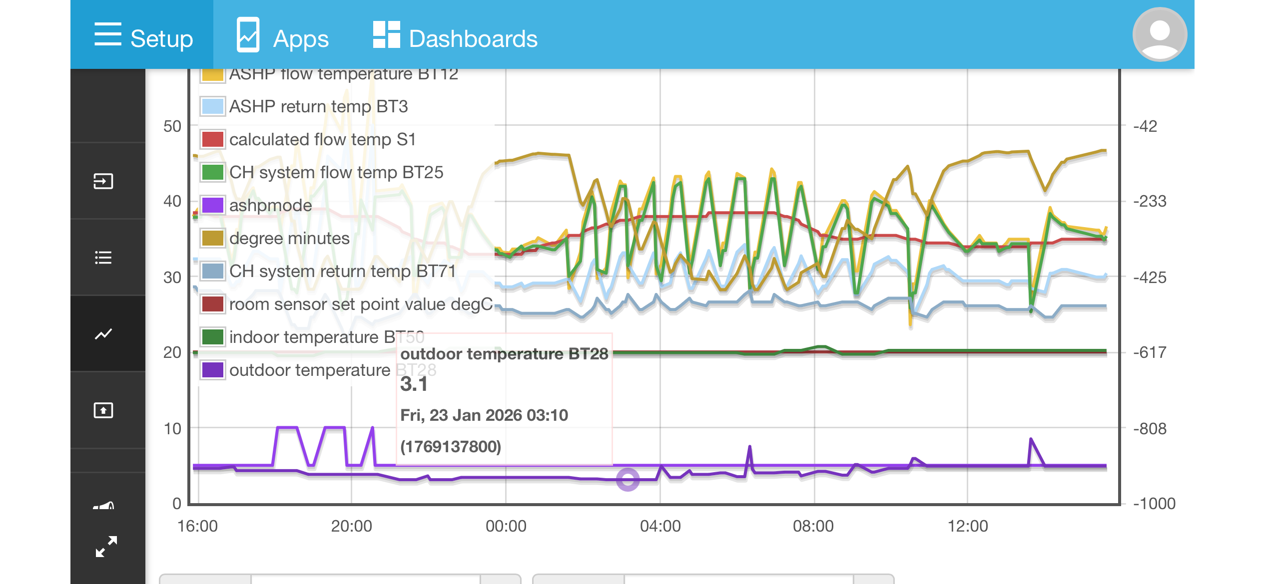 There’s clearly a lot more defrosting happening towards the end of the latest graph, as the Outdoor temperature dropped closer to 0 - although the DMs are still just trending upwards (following the ‘blip’ in S1). It will be interesting to see how it performed overnight, with (presumably) even lower outdoor temperatures but with BT50 close to the set-point.