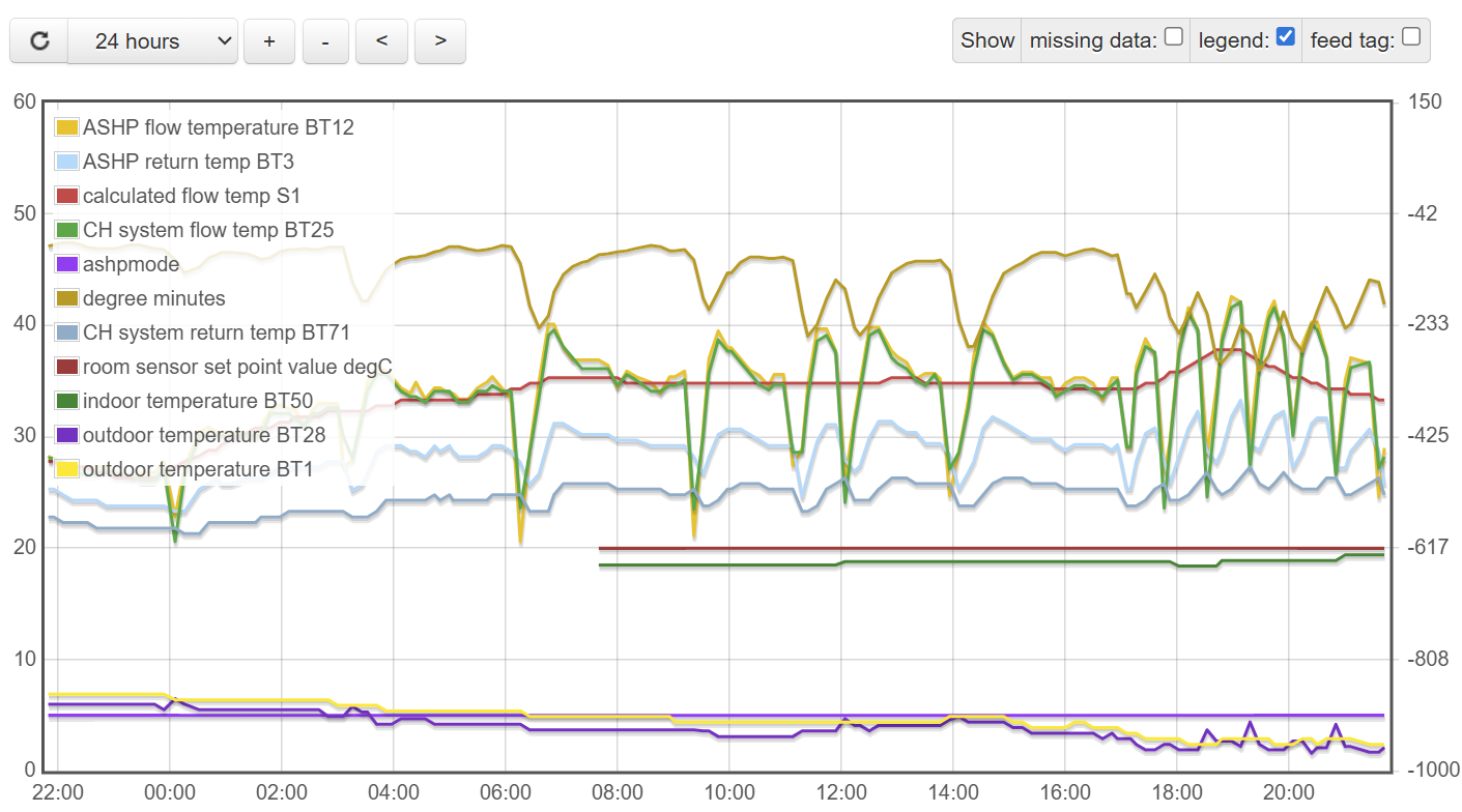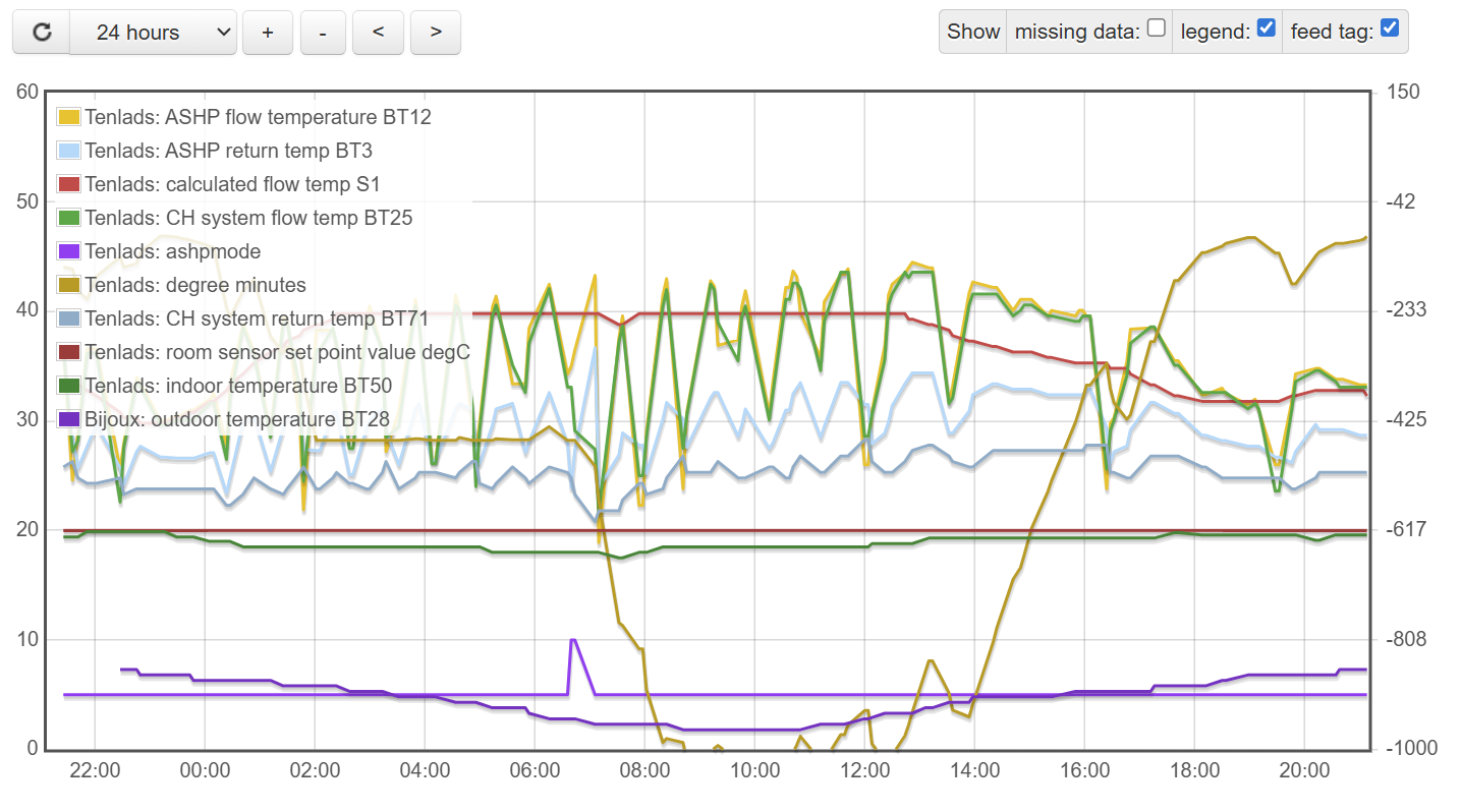 @tenlads: This would be a good graph to review with your Installer. If things don’t improve with slightly warmer weather during the daytime you might want to temporarily reduce the indoor target temperature a degree or so, to stop it trying quite so hard and attempting 40C flow. You could also consider using the immersion heater on the DHW tank so the heatpump can focus on the central heating instead.