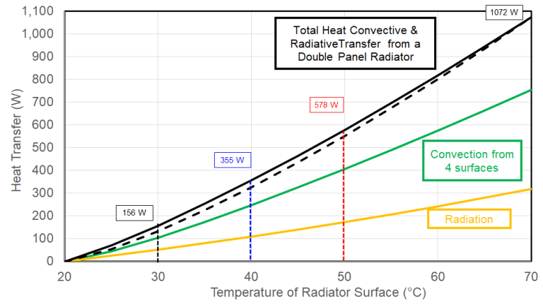 To add to Jake’s excellent reply, here’s a chart that illustrates how the output of a radiator (per square meter) varies with flow temperature