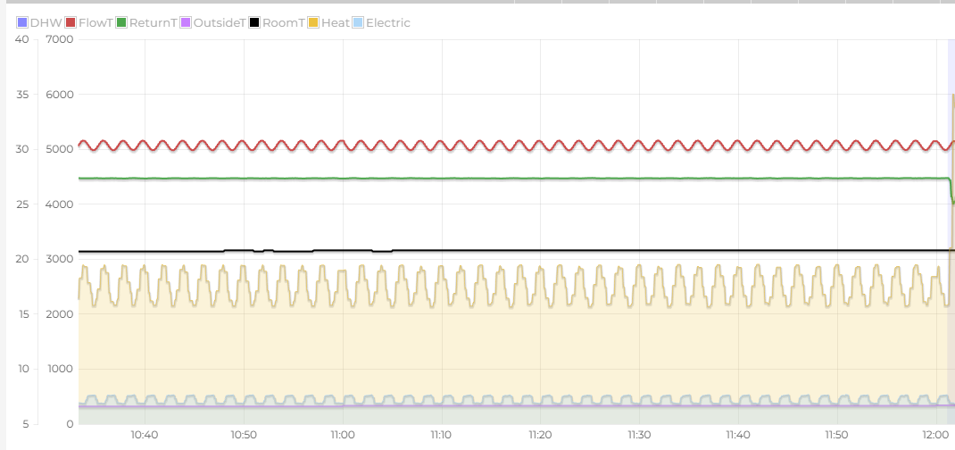 But this frequency cycling induces a cycle in LWT, hence a cycle in (LWT-RWT) deltaT (green line), hence a cycle in calculated energy output (light blue line). (The water flow rate - purple line - is essentially constant throughout).