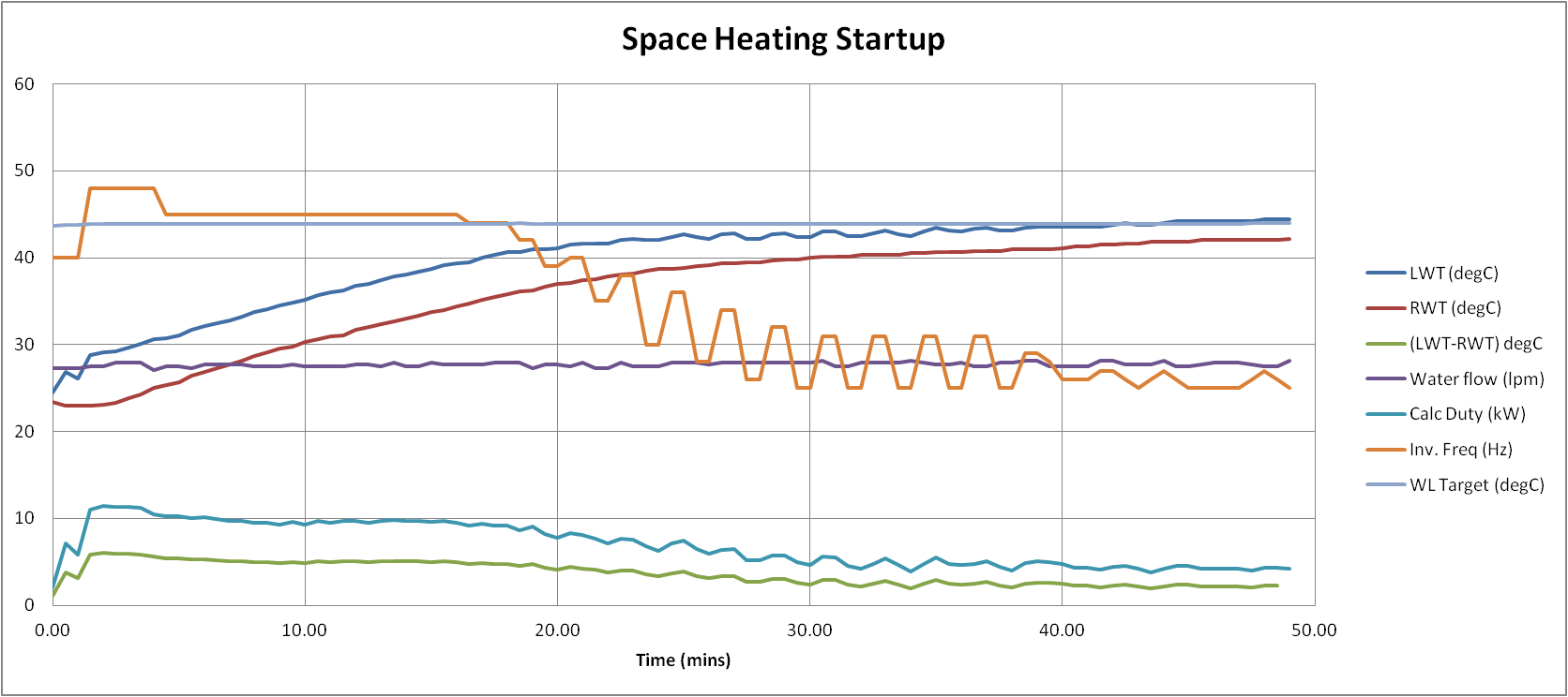 Once LWT reaches target (around minute 40) things settle down - the inverter frequency becomes almost constant, and as a result so does the energy output (~4kW - close to the Samsung-declared turndown of the 8kW HTQ). I should add that the roomstat was demanding throughout the whole period so was not controlling the process - WL was in control.