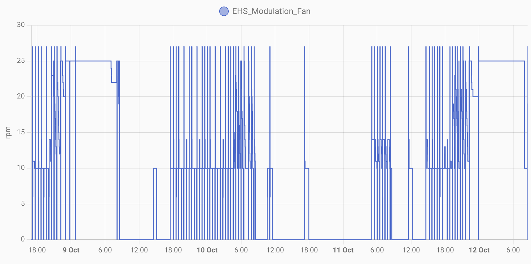 I toggled quiet mode, which made the unit go from 25rpm to 20rpm (no difference in heat delivery and an increase in COP, I presume from the fan not working so hard!)