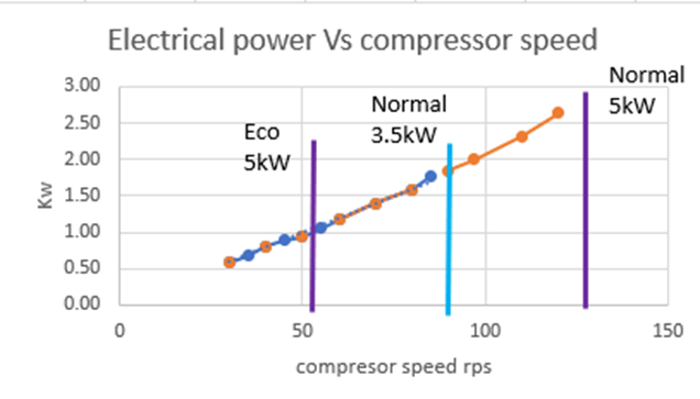 The 3.5kW machine (capped at 85 rps) seems to out-perform the 5kW machine when it is set on “Eco” mode ( capped at 50 rps) for cost savings. I suspect the 5kW “balance” mode may be closer to the 3.5kW performance. Unfortunately, I need to walk the dog now and that calculation can wait!