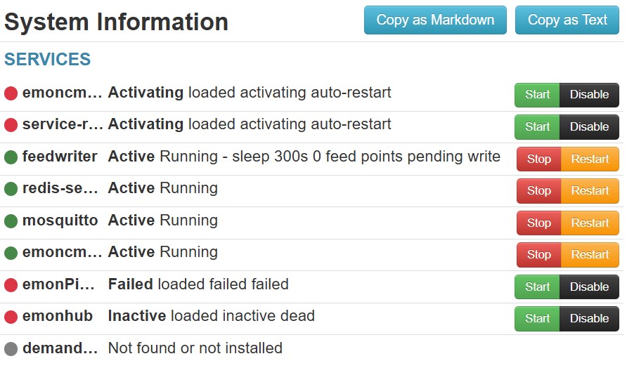 In both cases, when the install completed(?) I could start Emoncms and register a username. However the Admin page showed emoncms_mqtt, service-runner, (emonPiLCD & emonhub) not running correctly (see below). It was not possible to change their state using the Start / Disable buttons.