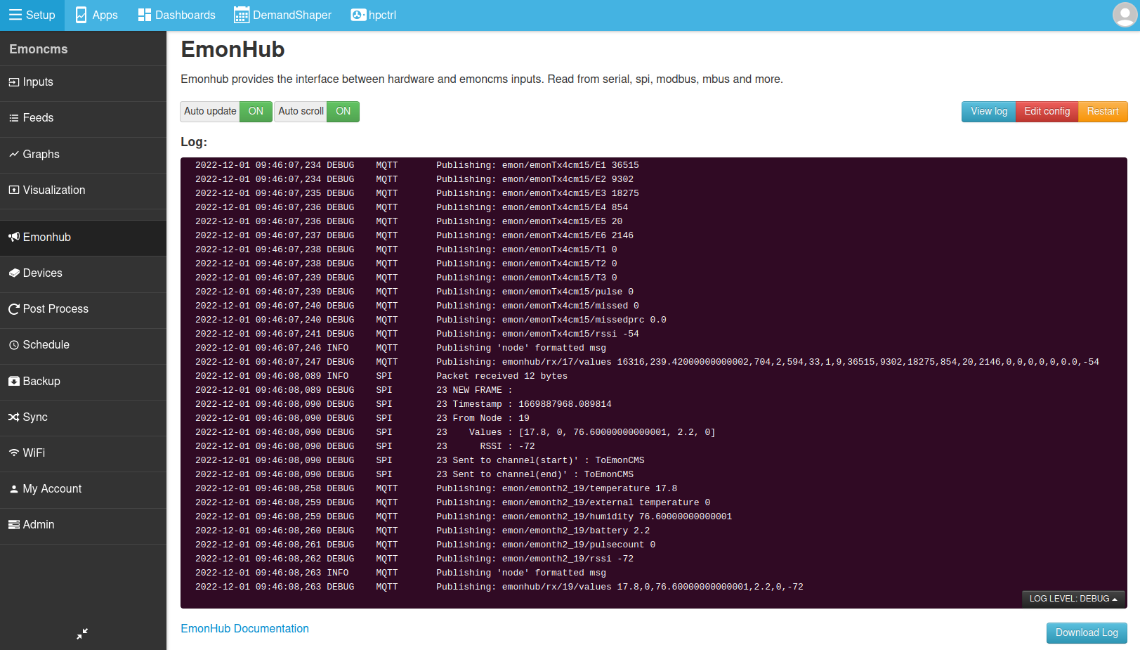 If you see data coming through there, there should also be inputs on the inputs page. If you dont see anything in the EmonHub log window try restarting EmonHub by pressing the ‘Restart’ button top right.