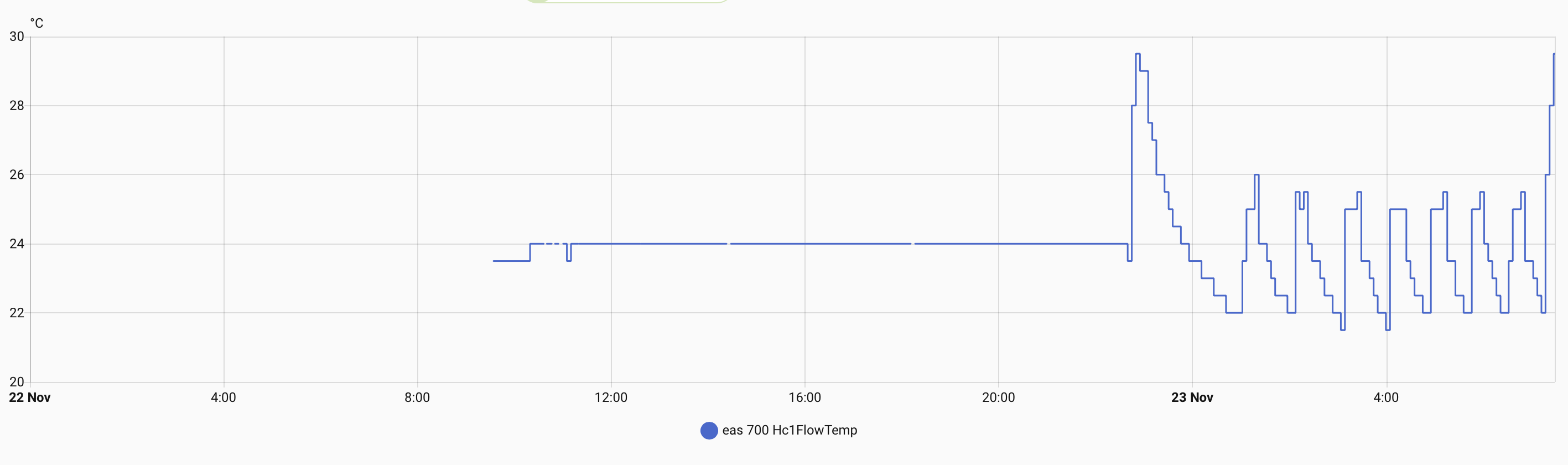 This stepping behaviour continues until the HMU target is roughly 20 K above the HC1 target, and then it levels off precisely at that point. That ~20 K offset is extremely consistent in my system and is visible on the attached trace. I can reset the behaviour by power-cycling the outdoor unit, after which the target jumps back down and the whole ramp repeats under similar conditions.