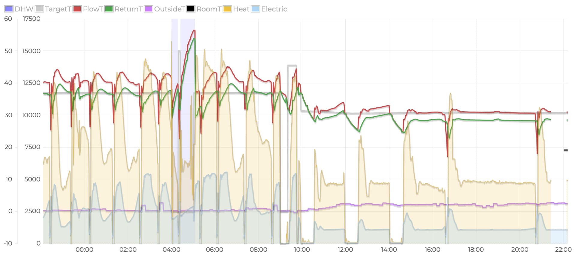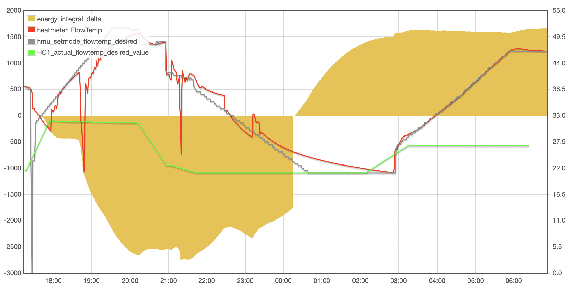 I tried to create a energy integral chart on emoncms, like @Zarch did, which takes the flow temperature from the heat pump monitor, minuses the hmu_setmode_flowtempdesired, adds it to the energy_integral_delta feed amount, then writes it to the energy_integral_delta (effectively cumulative). Itās not perfect as I started it a few minutes after the reboot, but itās not far away I think. Thereās something weird about 00:15 - if you were to shift the whole shaded area down it gets back to zero pretty close to when the heat pump started back up about 02:50.