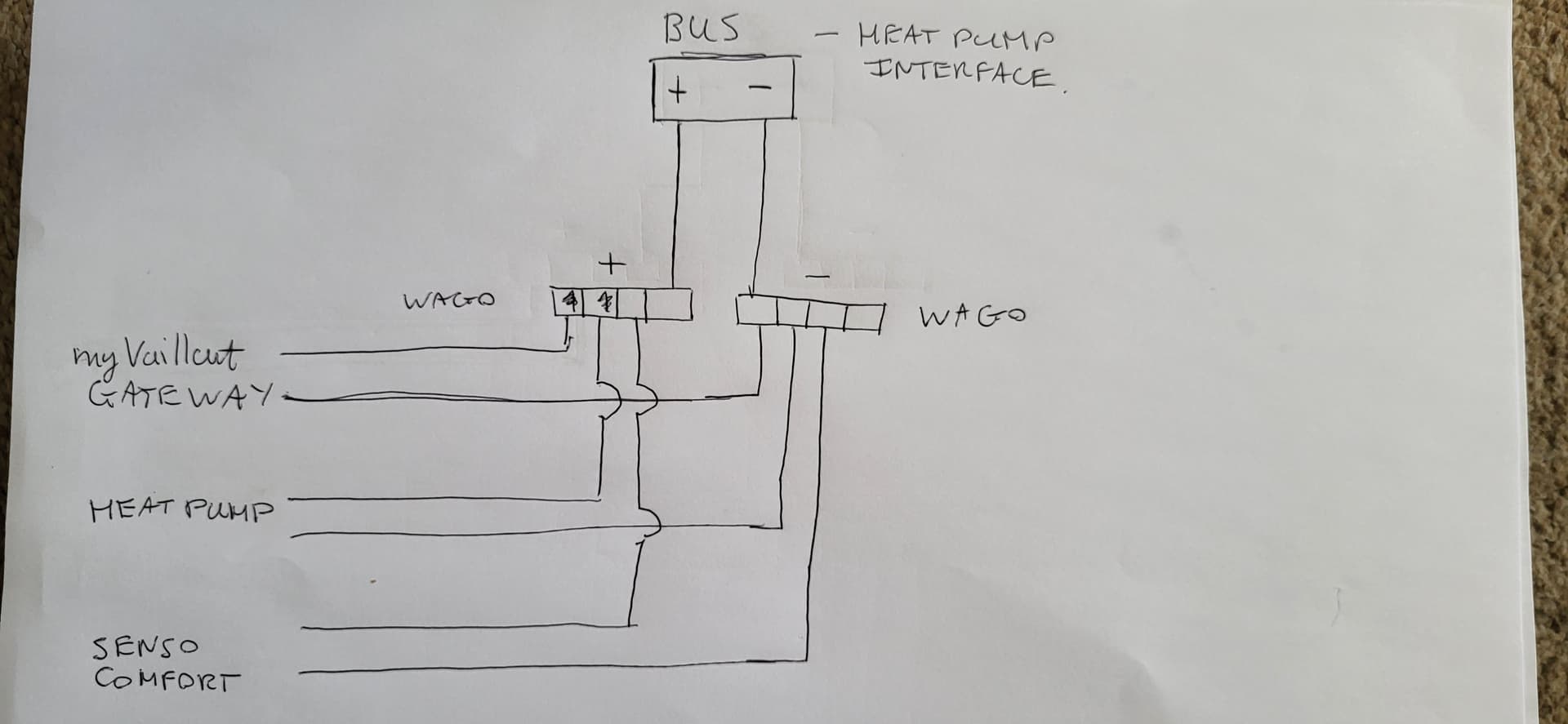 Going into the bus connector I have 2 off 2 core cables, 2 cores into positive, two cores into the negative. To connect my gateway i can just wire in my additional cores from the gateway cable into that? I don’t like doubling up on terminals, i think the tech support guy was suggesting there’s a splitter cable available to plug in from the gateway and the heatpump.