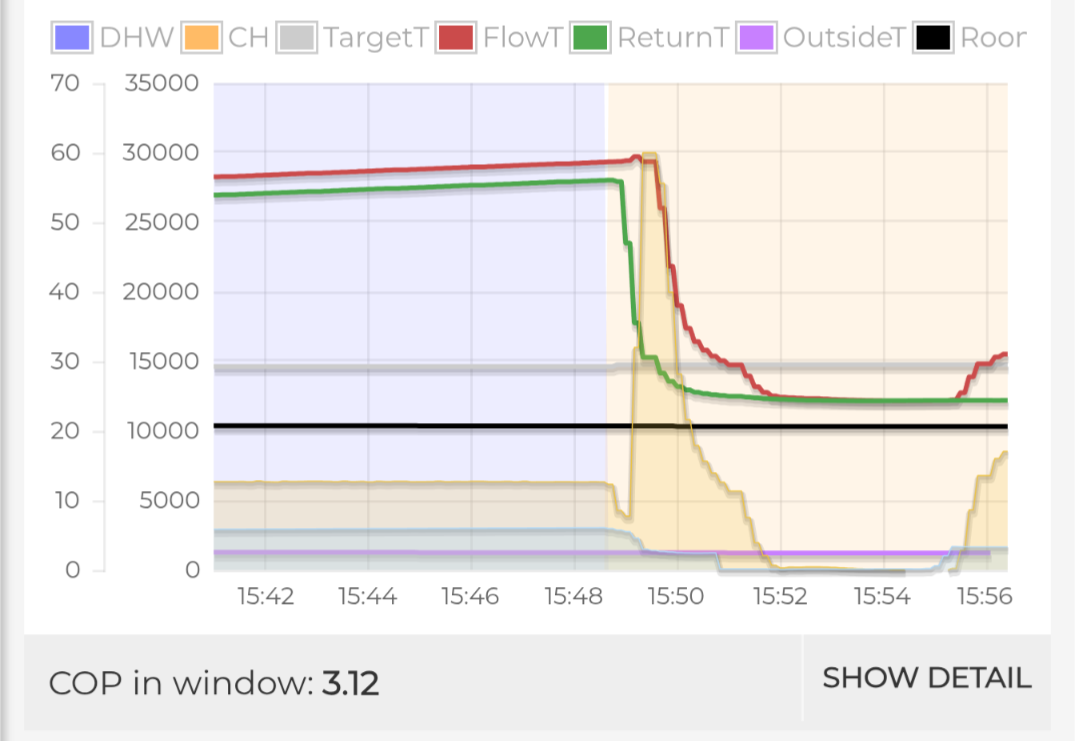 The effect of this on the COP is complicated if you try to split the COP into separate figures for DHW and CH, as the electrical energy has been consumed during the DHW cycle, but all that stored heat is dumped into the CH.