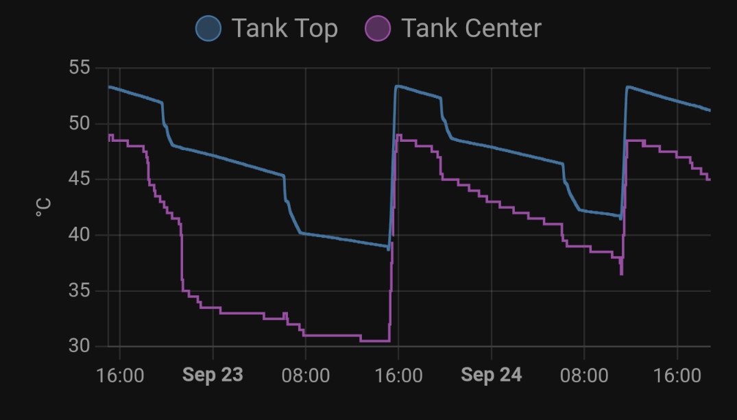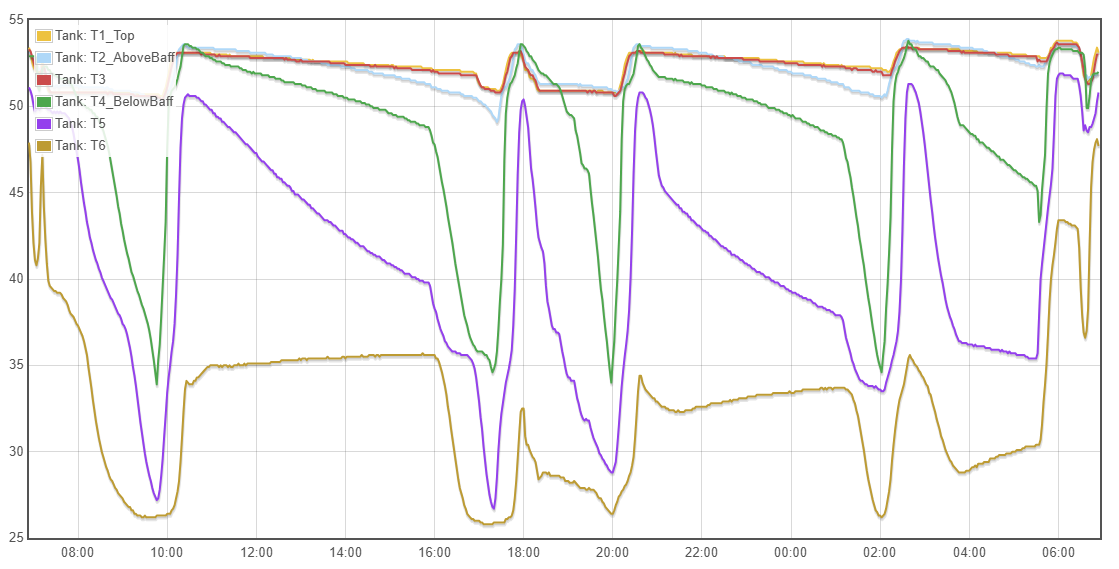 I don’t have any evidence to suggest this but it feels like when the tank reports, say, 45c, everything below the sensor point (a good 2/3 of the tank as I understand it) could be 15c or whatever the incoming cold water temp is. During the 1am reheat, it doesn’t take long for the warmer water around the sensor to reach 50c leaving everything below it some way below that point. Result is a tank which didn’t fully heat, presumably, since the hot water doesn’t go as far.