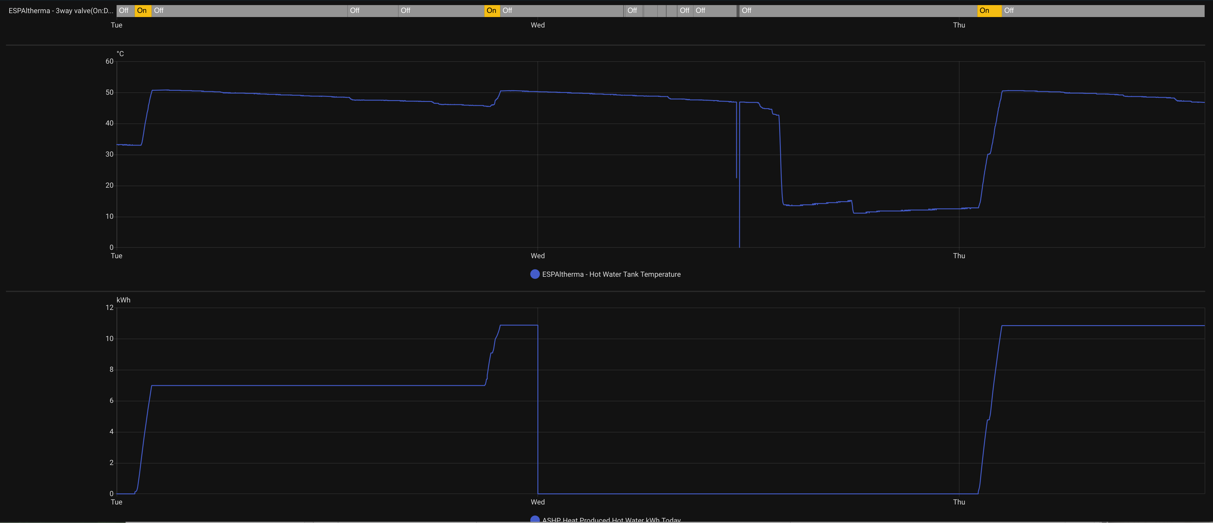 Starting on the left, Tuesday morning, the tank was 33ish, just under an hour to bring it back to 50c and 7kWh of produced heat.